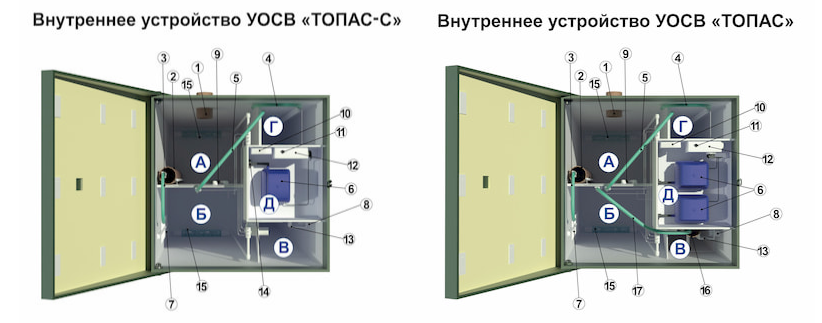 Наименование отсеков септика ТОПАС 4: